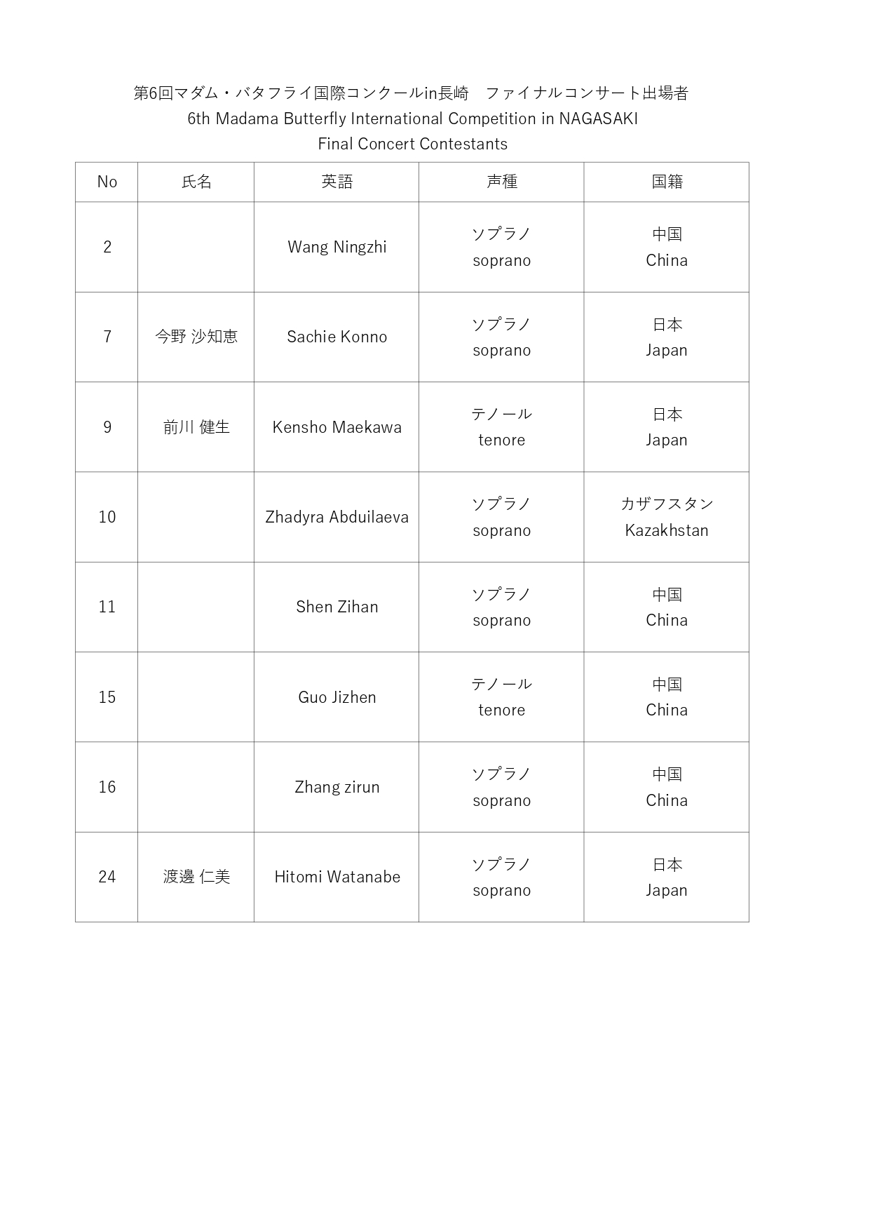 6th Madama Butterfly International Competition in NAGASAKI  Final Concert Contestants